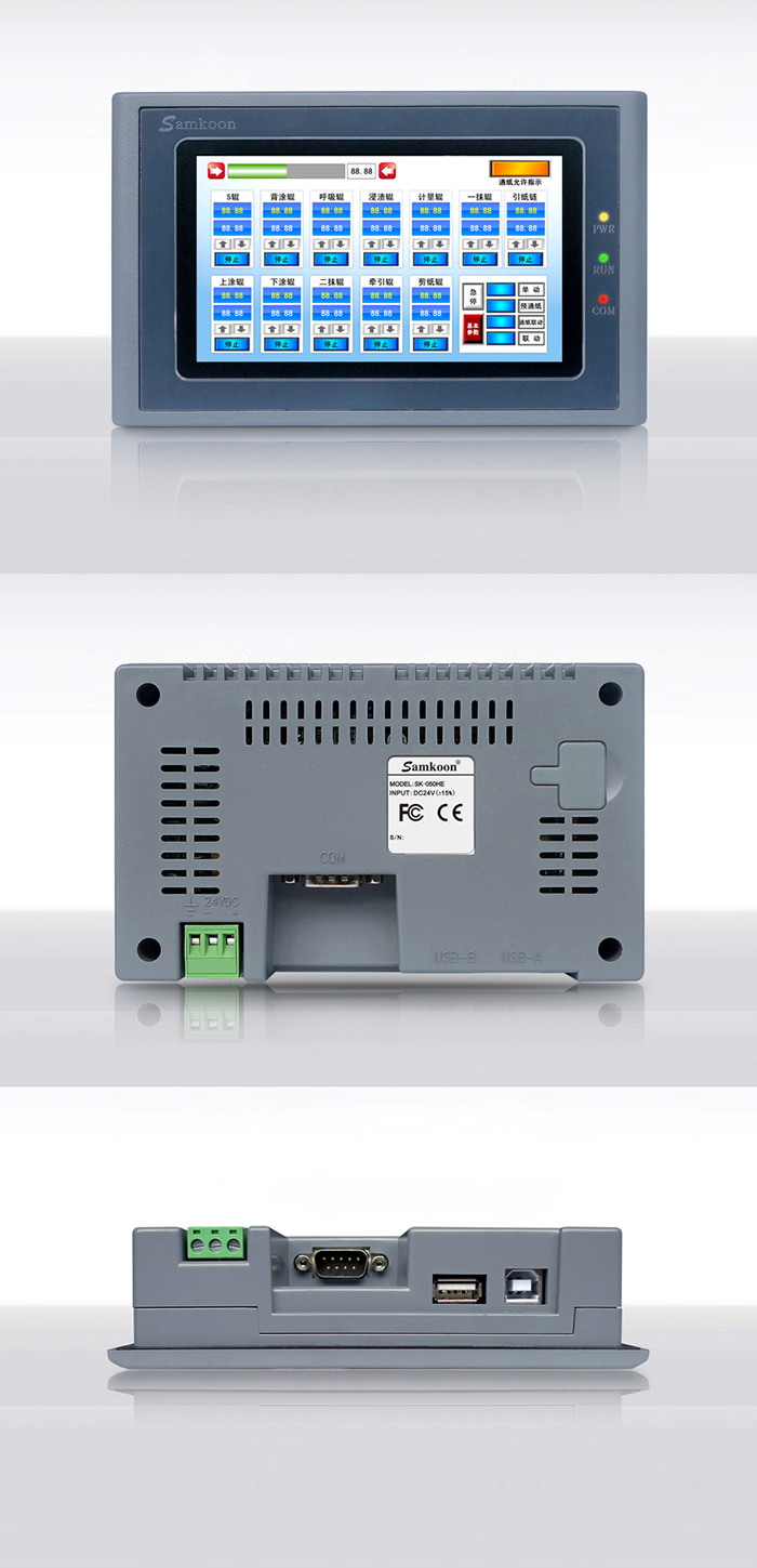 Samkoon SK系列觸摸屏是一款基于Linux系統(tǒng)的人機界面,符合EN55022和EN55024標準,符合FCC、CE、Class A,具有很強的抗干擾能力,符合工業(yè)環(huán)境的電磁兼容要求。該款產(chǎn)品配備有高性能的Cortex A8處理器,及高容量FLASH,可存儲大量數(shù)據(jù),實現(xiàn)數(shù)據(jù)斷電不丟失;支持U盤存儲,可以實現(xiàn)數(shù)據(jù)的導入導出、工程更新及配方更新功能;支持在線及離線模擬,可直接從PLC中獲取數(shù)據(jù);支持串口打印機,顯現(xiàn)畫面及數(shù)據(jù)打印;支持一屏多機,實現(xiàn)最大連接32個PLC或智能設備;支持多國語言,可實現(xiàn)5種語言任意切換;支持以太網(wǎng)通訊下載功能。
