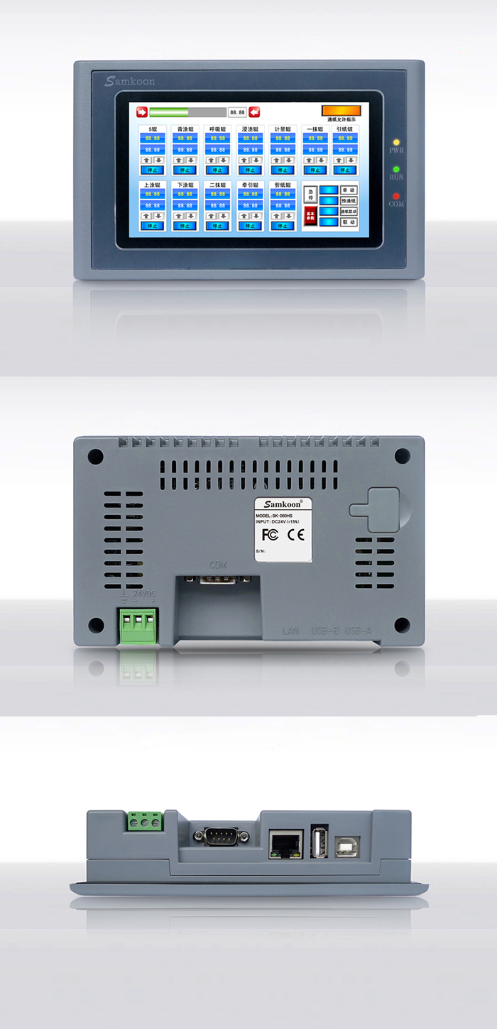 Samkoon SK系列觸摸屏是一款基于Linux系統的人機界面,符合EN55022和EN55024標準,符合FCC、CE、Class A,具有很強的抗干擾能力,符合工業環境的電磁兼容要求。該款產品配備有高性能的Cortex A8處理器,及高容量FLASH,可存儲大量數據,實現數據斷電不丟失;支持U盤存儲,可以實現數據的導入導出、工程更新及配方更新功能;支持在線及離線模擬,可直接從PLC中獲取數據;支持串口打印機,顯現畫面及數據打印;支持一屏多機,實現最大連接32個PLC或智能設備;支持多國語言,可實現5種語言任意切換;支持以太網通訊下載功能。