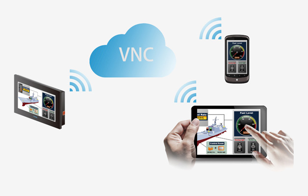 2.VNC功能。一般的設備操作,操作員只需在HMI操作界面操作就可以了。如果說HMI置放的位置不方便經常或者長時間操作,或者操作員想隨時隨地查看和操作HMI界面,這時永宏C3/P5系列觸摸屏就能很好的幫您解決這個問題。針對操作員不在HMI操作界面現場的情況,操作員可以在電腦上使用VNC客戶端,或者手機上下載VNC軟件,通過網絡,可直接將HMI的畫面顯示在電腦或者手機上,同時也能在電腦或手機上操作,支持此功能的HMI需配帶以太網接口。